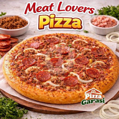 Pizza dengan topping saos tomat daging sapi cincang sosis pepperoni bawang bombay dan keju mozarella