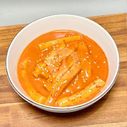 Tteokbokki Yang Kenyal Dengan Kuah Creamy Disajikan Dengan Hangat Ditambah Toping Bihun Ubi Korea,Sosis Dan Mozarella