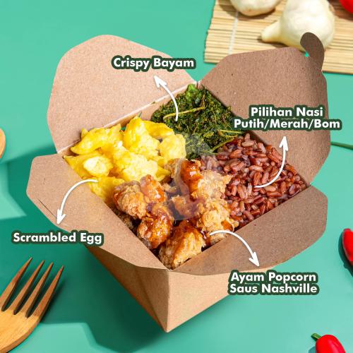 Value Meal Saus Khas Amerika Yang Pedas Manis Kaya Rempah, (Pilihan Nasi + Ayam Popcorn Saus Nashville + Telur + Crispy Bayam/Kremes)