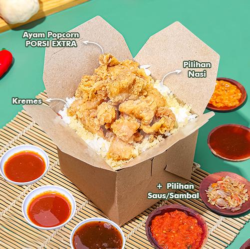 Porsi EXTRA Lebih Banyak, (Pilihan Nasi + Kremes + Ayam Popcorn PORSI EXTRA + Pilihan Saus/Sambal)