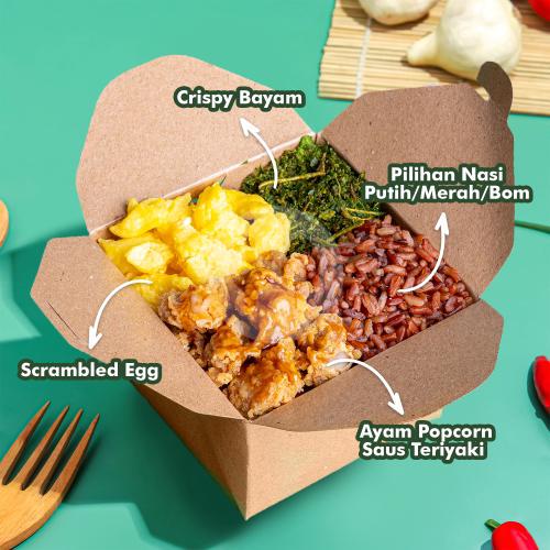 Value Meal Saus Otentik ala Jepang, Wajib Coba, (Pilihan Nasi + Ayam Popcorn Saus Teriyaki + Telur + Crispy Bayam/Kremes)