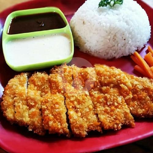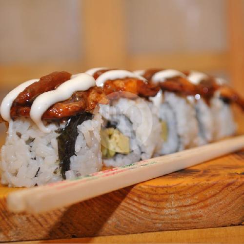Sushi dengan isi chicken katsu, telur, timun dan toping saus Ladanya