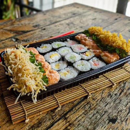 Sushi dengan isi telur, timun dan topig ikan salmon yang di masak dengan saus teriyaki