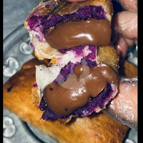 Lumpia ubi isi coklat leleh, gurih dan manis dalam satu gigitan diberi topping susu coklat. 1 Box isi 5.