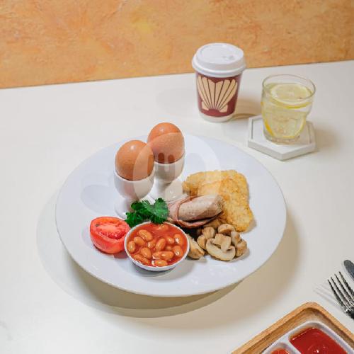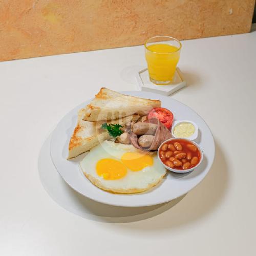 Sunny Side Up, Toasts, Beef Bacon, Chicken Sausages, Butter, And Baked Bean Served With Orange Juice