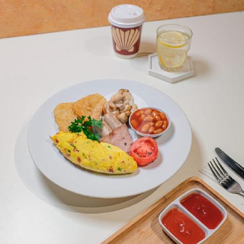 Omellet With Beef Bacon, Green Paprika, Onion, And Mushroom With Chicken Sausages, Tomato, Hash Brown And Red Bean