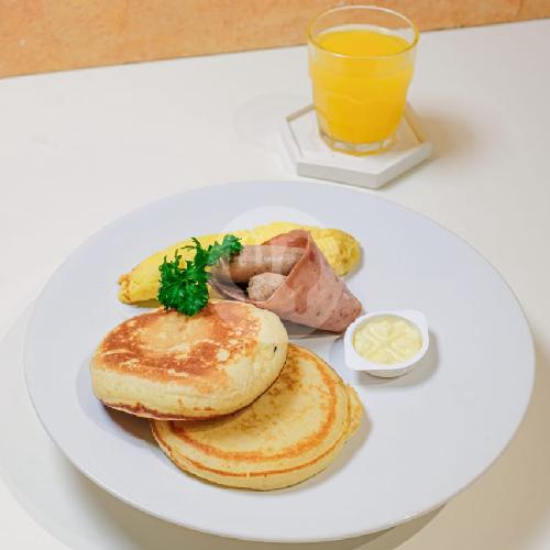 2pcs Pancake, Omelette, Beef Bacon, Chicken Sausages, Butter, Served With Orange Juice