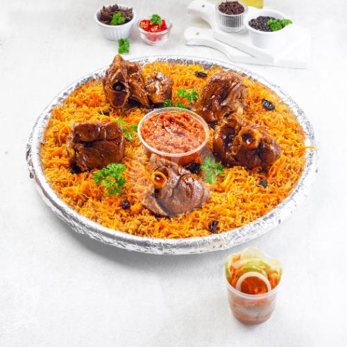 5 porsi nasi Mandhi + 5 porsi nasi kabsah+ ayam 8 pcs + sambal large + Garlic mayo large + Topping Kismis dan Wortel