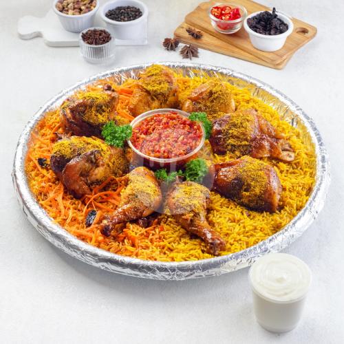 5 porsi nasi Biryani + 5 porsi nasi kabsah + ayam 8 pcs + sambal large + Garlic mayo large + Topping Wortel & Kismis + bawang goreng