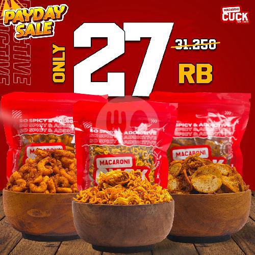 Makaroni Ngembang Reguler (menu 1), Mie Kremes Reguler (menu 2), Keripik Cireng Reguler (menu 3 )