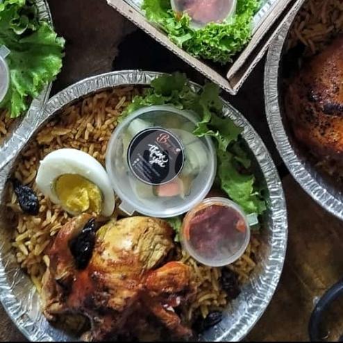 Nasi kebuli beras basmati 1 porsi dengan rempah timur tengah yg menggoda dan ayam rosted yg gurih dan renyah dilengkapi acar timun dan nanas Serta Sambal