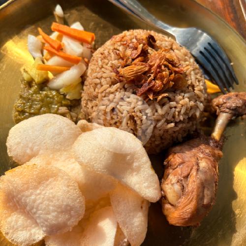 Nasi Kebuli Ayam Bumbu Yang Diungkep Dengan Rempah Kebuli Dan Digoreng Basah (Acar+Kerupuk+Sambal)