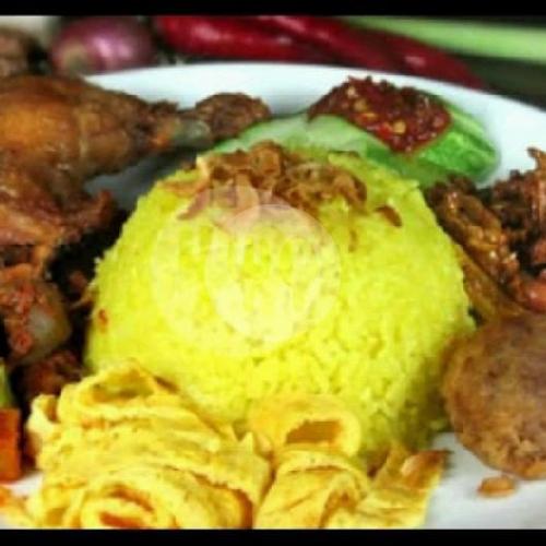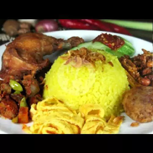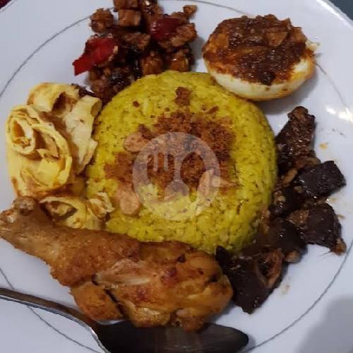 Nasi kuning + Ayam Goreng + Tempe Orek + Mie + Telur Suwir + Bergedel + Telur + Serundeng