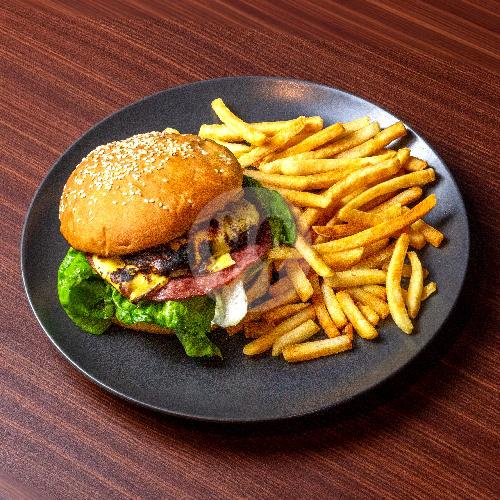 Cheeseburger Spesial Sniper. Berisikan Patty Import AUS, Smoked Beef, Red Cheddar Cheese, Telur, Caramelized Onion, Lettuce, Mayo & BBQ Mustard Sauce. Disajikan dengan French Fries/Crinkle Cut Fries.