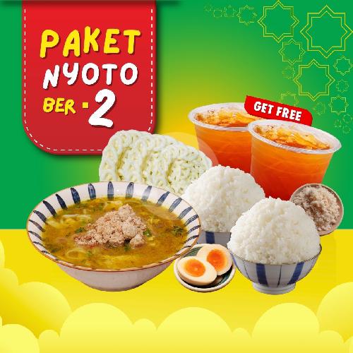 PAKET PUAS Nyoto ber-2, terdiri dari: 1 Porsi Soto Ayam Lamongan Spesial, 2 Porsi Nasi Pulen, 1 Telur Rebus, 1 Extra Koya, 1 Krupukblek (isi +-3). GRATIS 2 Es Teh Manis 16oz. Semua Kondimen Terpisah (Sambal, Koya, Irisan Jeruk Nipis Dan Suun).
