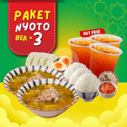 PAKET Nyoto ber-3, terdiri dari 2 Porsi Soto Ayam Lamongan Spesial, 3 Porsi Nasi Pulen, 1 Telur Rebus, 1 Extra Koya, 1 Extra Sambal, 1 Krupukblek (isi +-3). GRATIS 3 Es Teh Manis. Semua Kondimen Terpisah (Sambal, Koya, Irisan Jeruk Nipis Dan Suun).