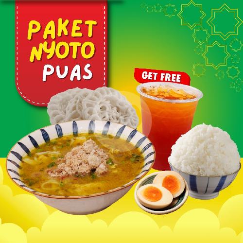 Paket Nyoto Puas terdiri dari: 1 Porsi Nasi Soto Ayam Lamongan Spesial, 1 Telur Rebus, 1 Krupukblek (isi 3). GRATIS Es Teh Manis 16oz. Semua Kondimen Terpisah (Sambal, Koya, Irisan Jeruk Nipis Dan Suun).
