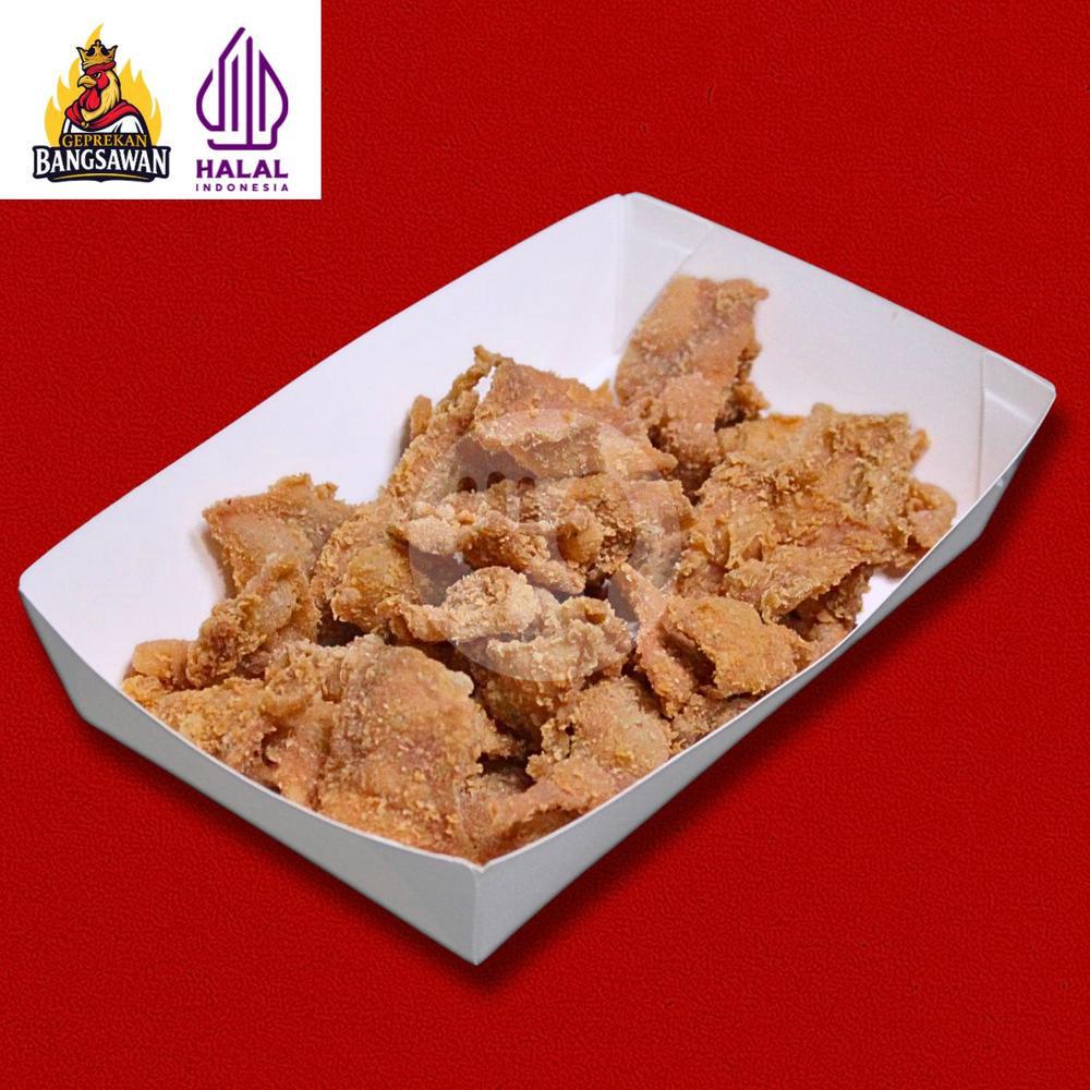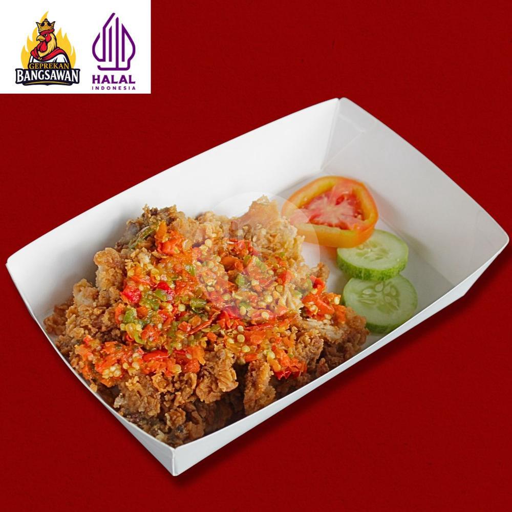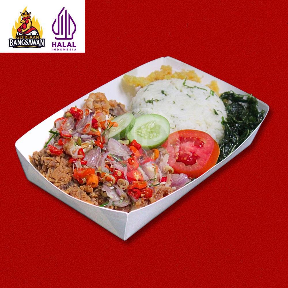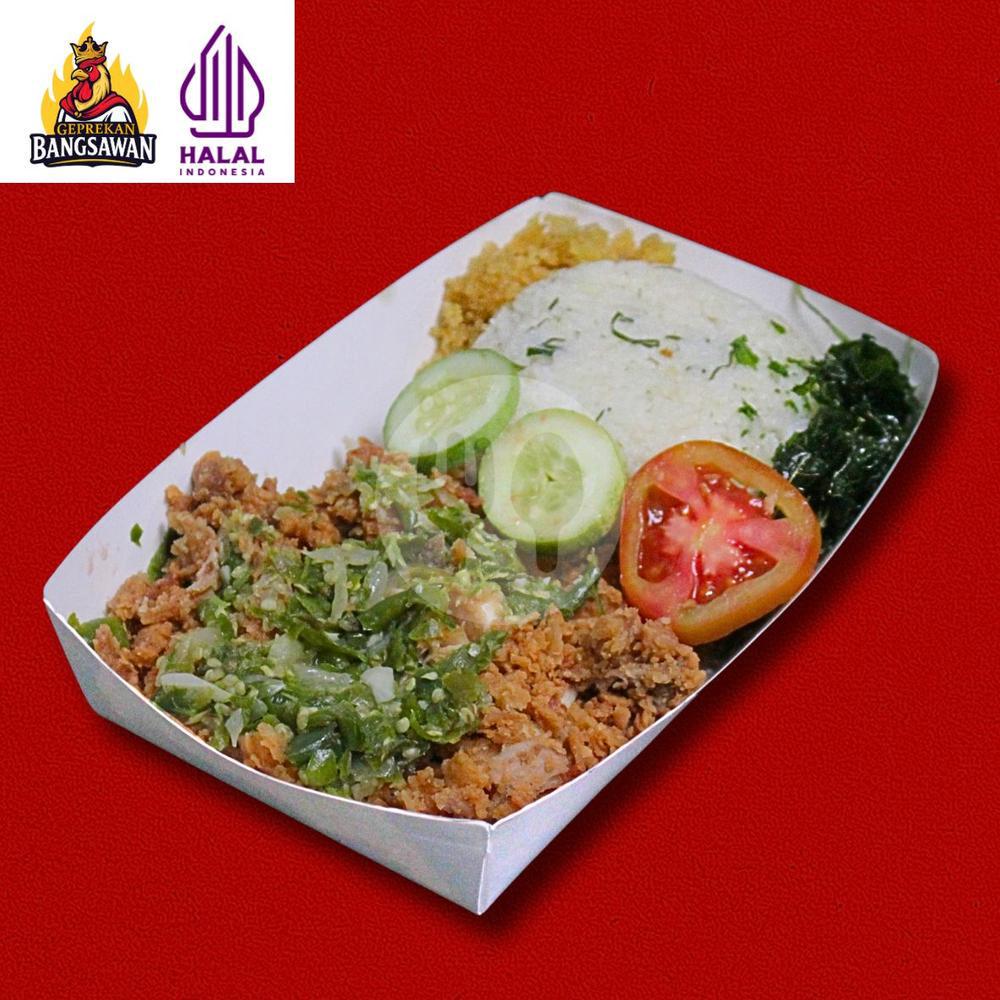 Nasi + Ayam Geprek + Sayuran + Sambal Ijo + Bayam Crispy (jika ada), Kremesan (jika ada)