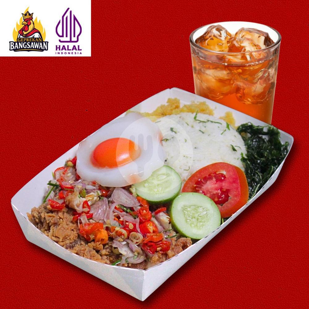Nasi + Ayam Geprek + Sayuran + Sambal Matah + Bayam Crispy (jika ada), Kremesan (jika ada)