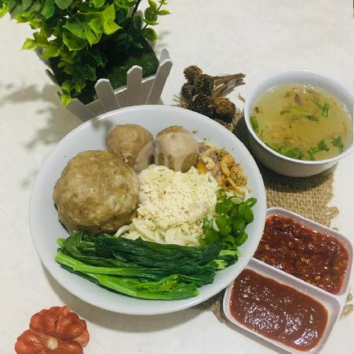 pilihan mie yamin asin atau yamin manis dengan toping baso urat jumbo ditambah sayuran dan cincang daging