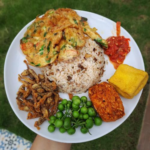 Nasi Tutug Oncom + Tahu + Tempe + Telur + Sambal + Lalapan