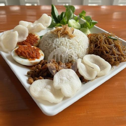 Nasi uduk, bihun, telur balado, tempe orek, sambel dan krupuk.