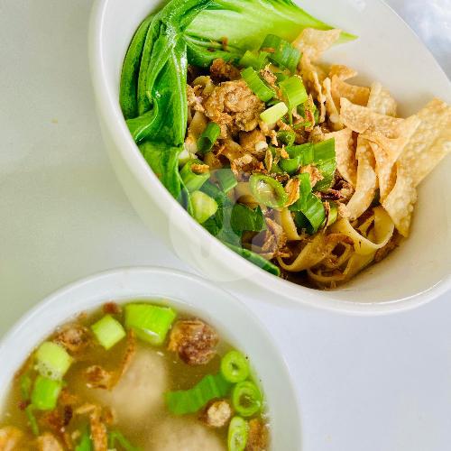 Olahan mie tiau kering dengan bumbu spesial ditambah toping ayam, daun bawang, dan pangsit goreng