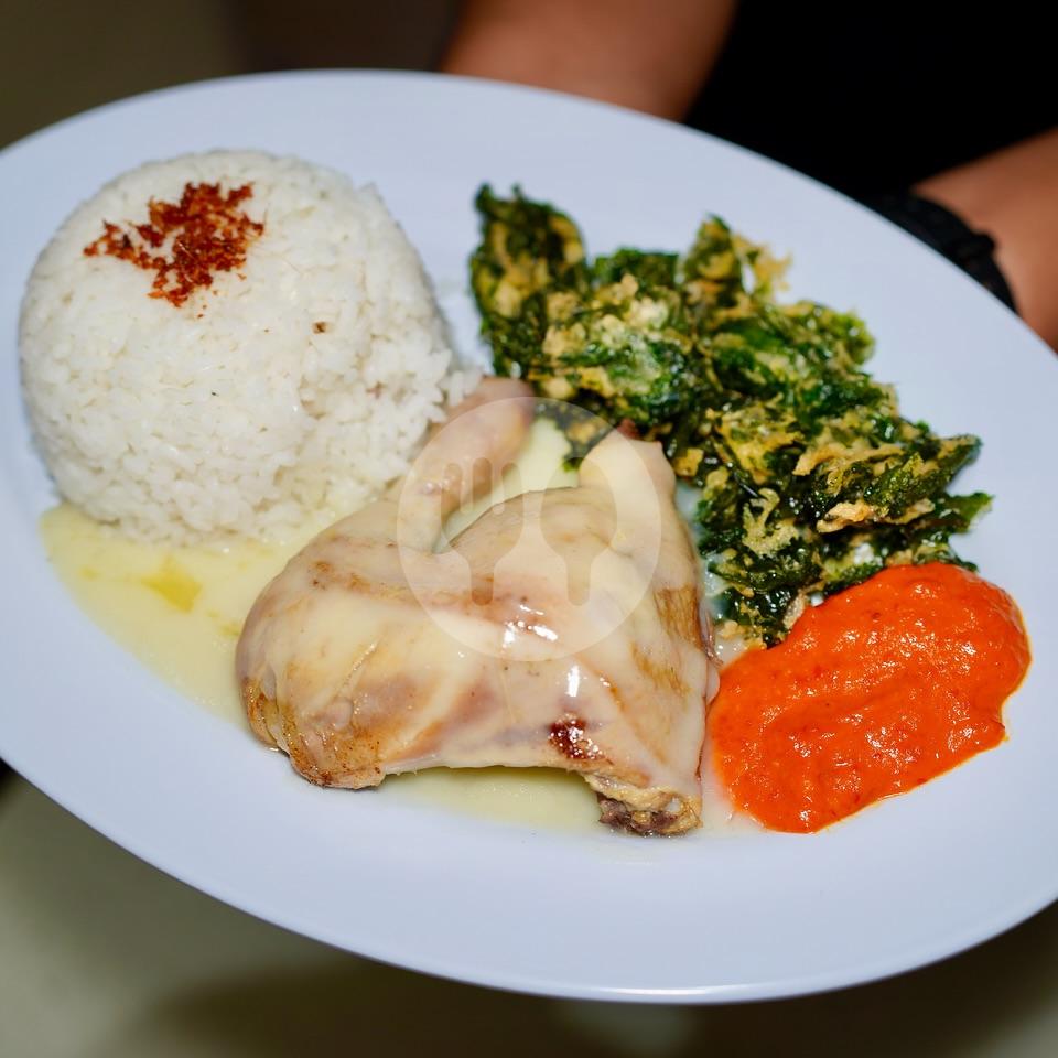 Nasi Putih, Ayam Pop, Sambal & Daun Singkong Crispy