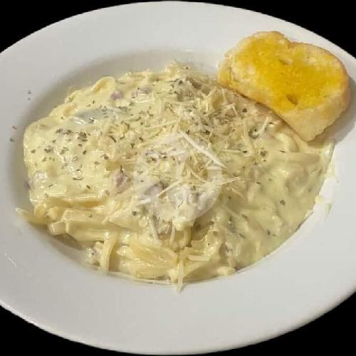 Spaghetti pasta mixed with fresh milk, cream, and smoked beef