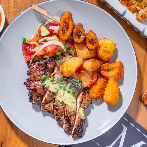 With Kamils Potatoes, Green Sauce, Hot Chilli Sauce, Pisang Alloco And Mixed Salad.