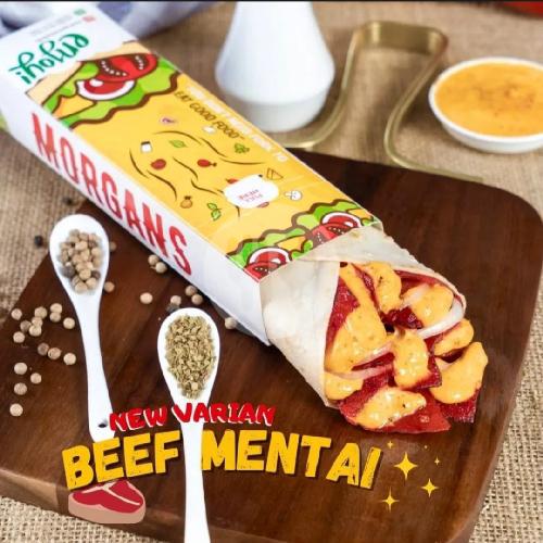 Tortila,juicy beef,grilled onion, spesial mentai sauce, dan sauce khas Morgans