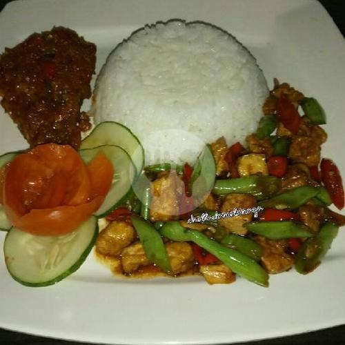 Nasi putih, aneka tumis(buncis, daun pepaya, melinjo, terong dll), tahu / tempe, sambal ijo , kuah padang.