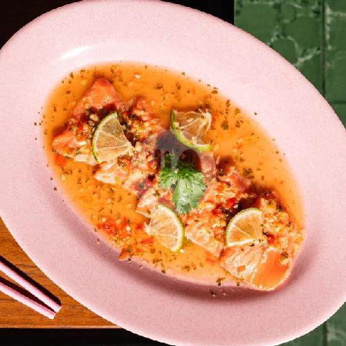 Potongan Slice Salmon Sashimi Dengan Saus Asam, Segar