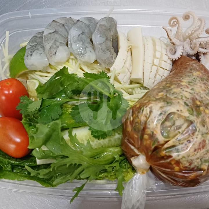 Udang mentah, baby gurita matang, cumi flowers matang, pepaya muda,mangga muda, romaine, timun, bihun Thailand , saos som tam thailand