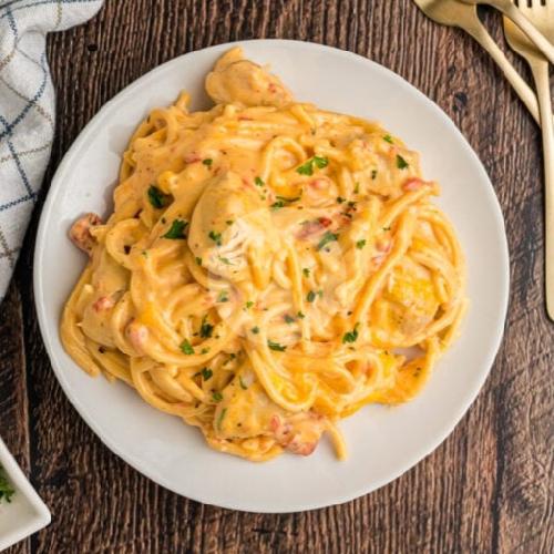 Spaghetti ditumis dengan saus Creamy Dan Keju Olahan ditambahkan dengan bawang bombai panggang dan ayam dada fillet potong dadu yang di panggang dahulu serta dilumuri bumbu Disajikan dengan keju cheddar parut dan parsley