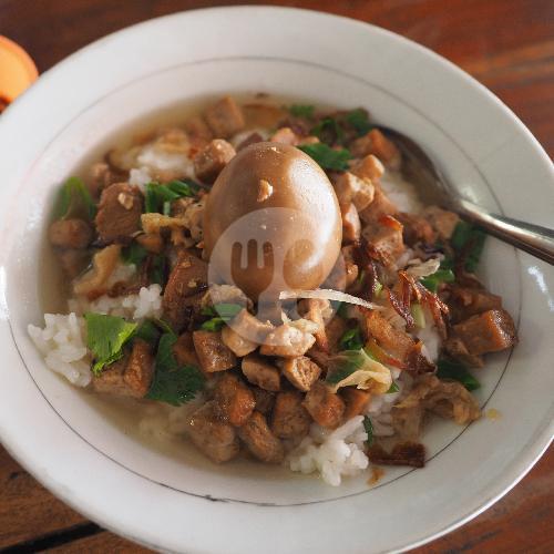 Nasi dengan potongan tahu, ayam, dan telur dengan rasa gurih manis + kuah kaldu hangat