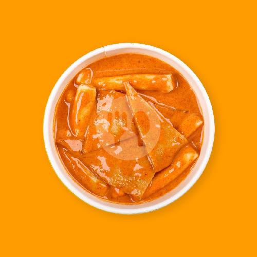 Tteok Kenyan Yang Disajikan Dengan Saos Rose Yang Pedas, Manis Dan Creamy. Ditambah Toping Odeng Yang Gurih
